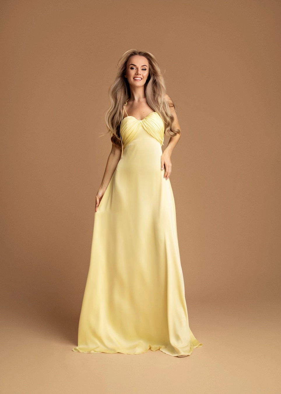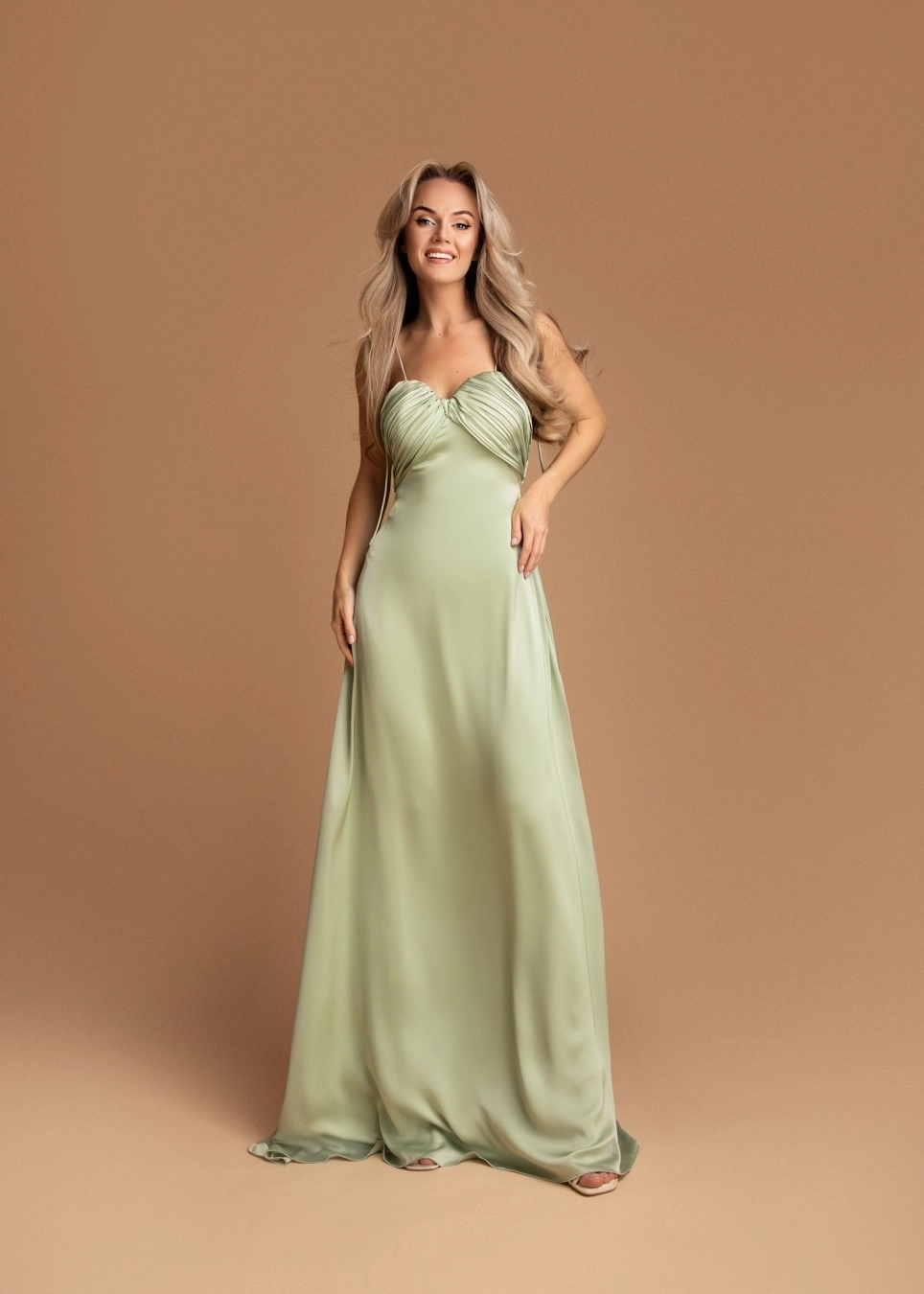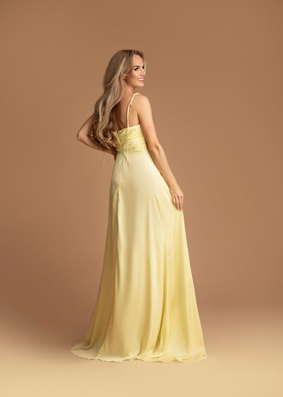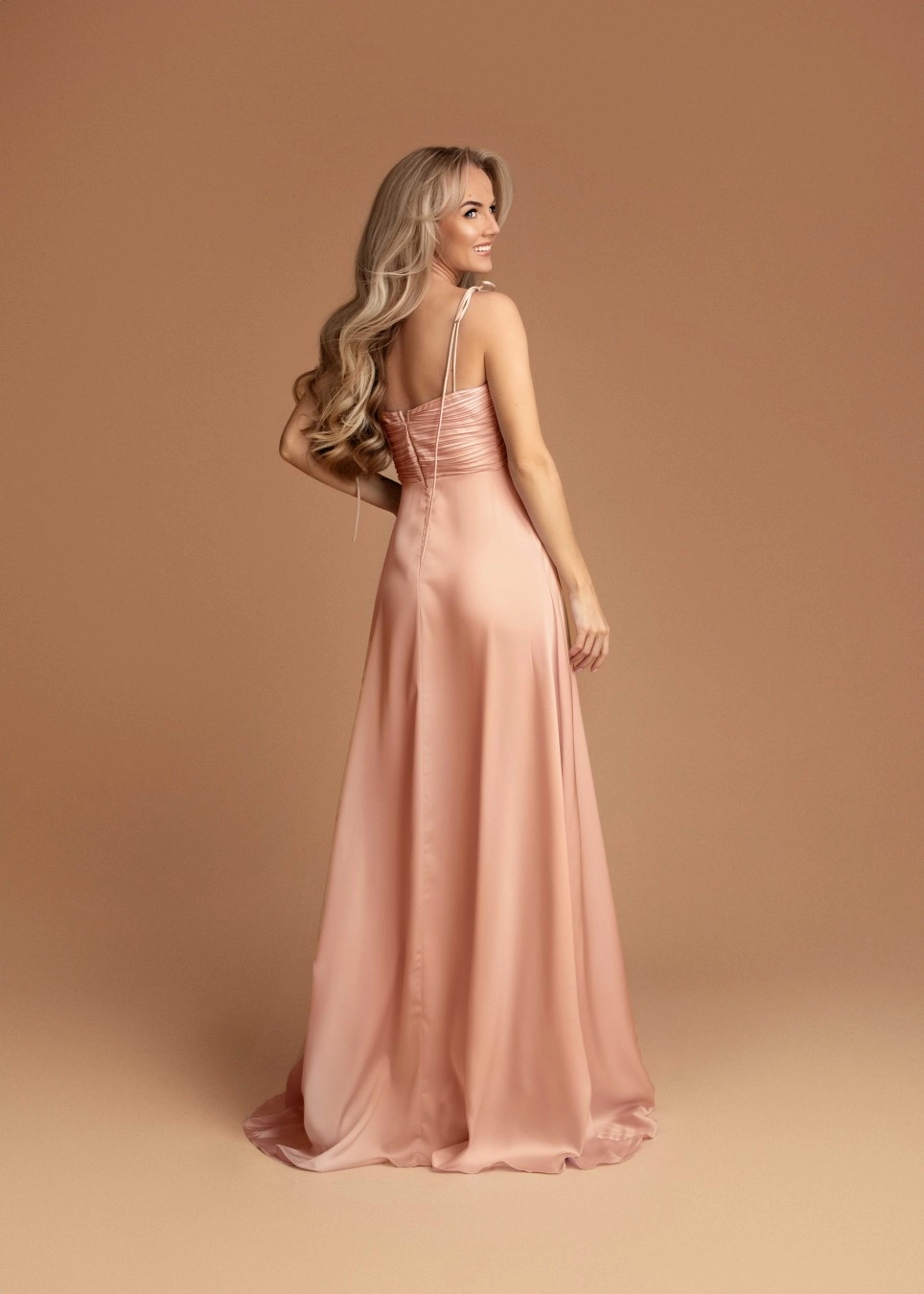 Avondjurk met plooi, geplooide bovenlijf, verstevigd borstlijn, zorgt voor mooi decolleté, open rug, verstelbare dunne schouderbanden, ritssluiting in de rug naad, chic sluik vallende japon