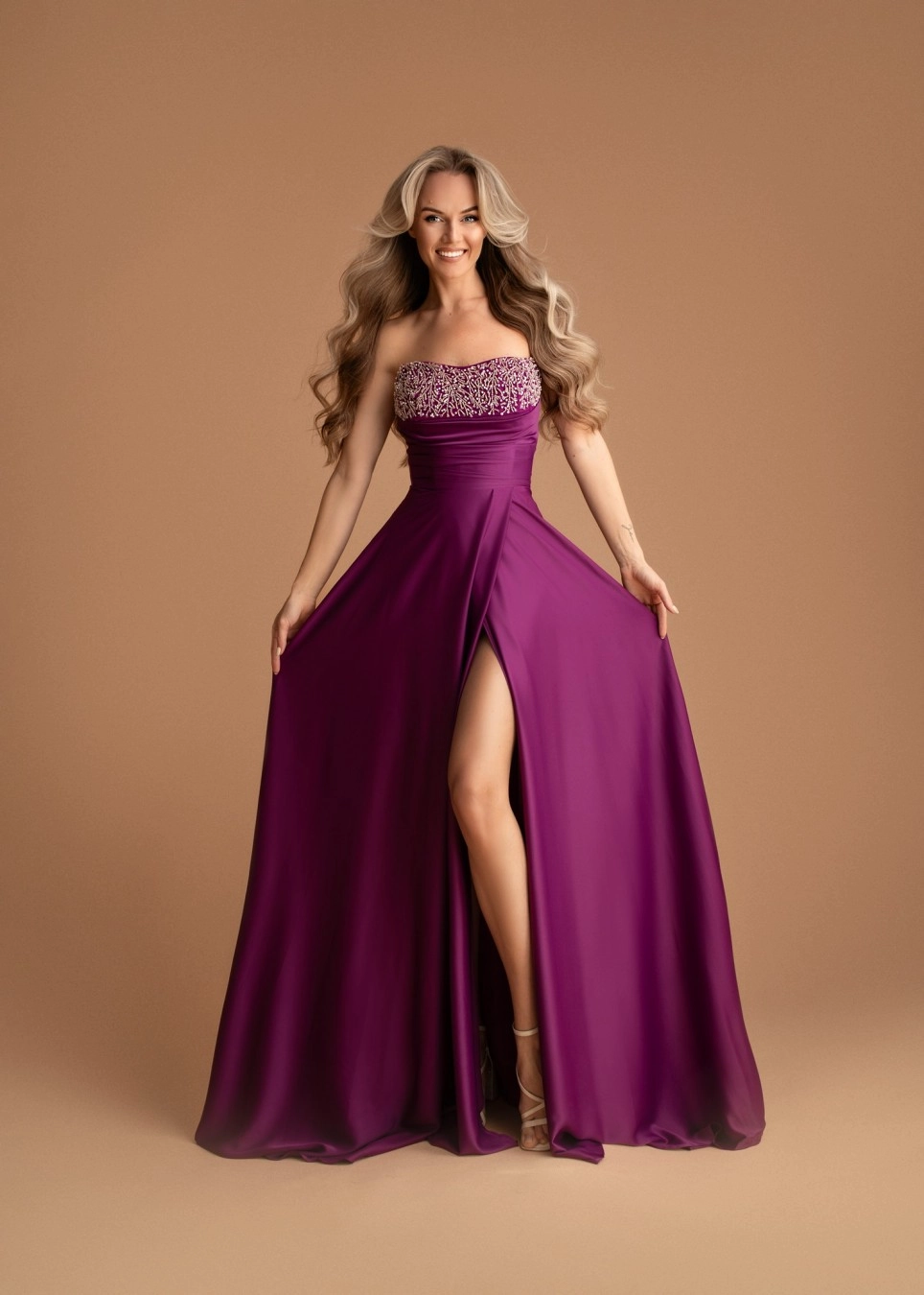 Strapless corsage baljurk, bovenlijf met wide scoop halslijn, ondersteunt mooi decolleté, versierd met siersteentjes, hoge geplooide taille, wijd uitlopende rok, heeft kniehoog split