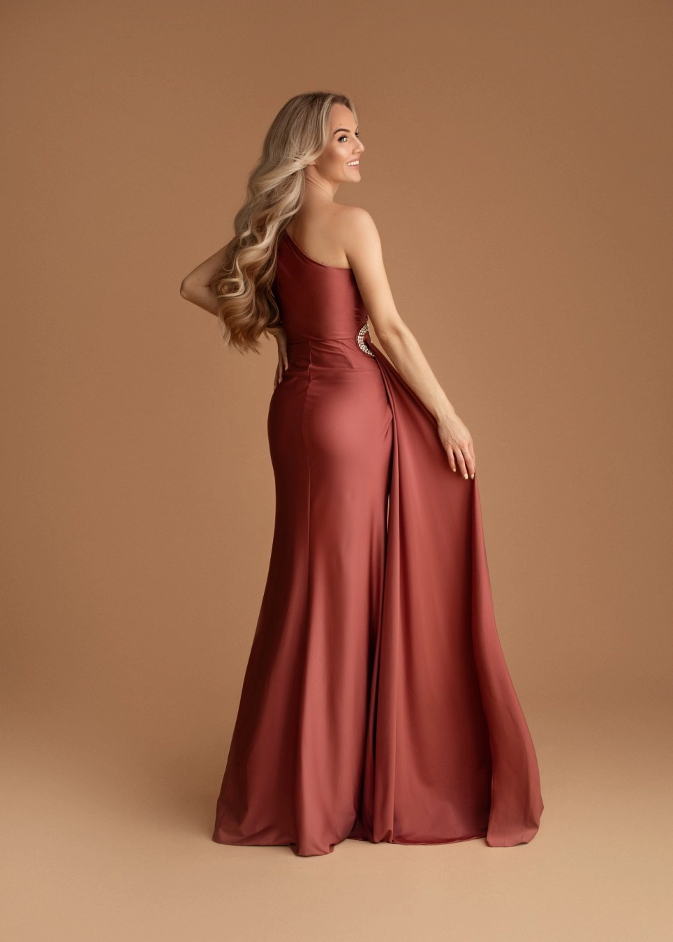 Avondjurk versierd met broche, aangepaste A-lijn, nauwsluitende bovenlijf met asymmetrische halslijn, heeft een schouderband, bedekt decolleté, rug met ritssluiting in de naad, flatterende taille versierd met ronde broche, heeft volant, wijd uitlopende rok met kniehoog split, prachtige chiffon japon met satijn voering, keuze van S / M / L