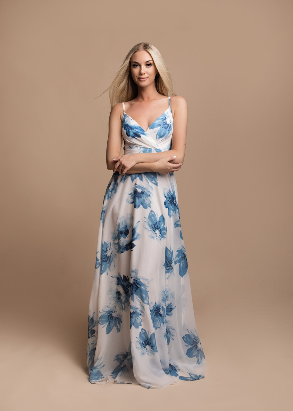 Jurkje in bloemenprint, lange sluik vallende japon, nauwsluitende lijfje met V-hals, verstevigende borstlijn dat ondersteunt mooi decolleté, dunne schouderbandjes, kant bedekt rug met elastische band, hoge geplooide flatterende taille, klokrokje, eenvoudige stijl feestelijke polyester jurkje met satijn voering, keuze van S / M / L