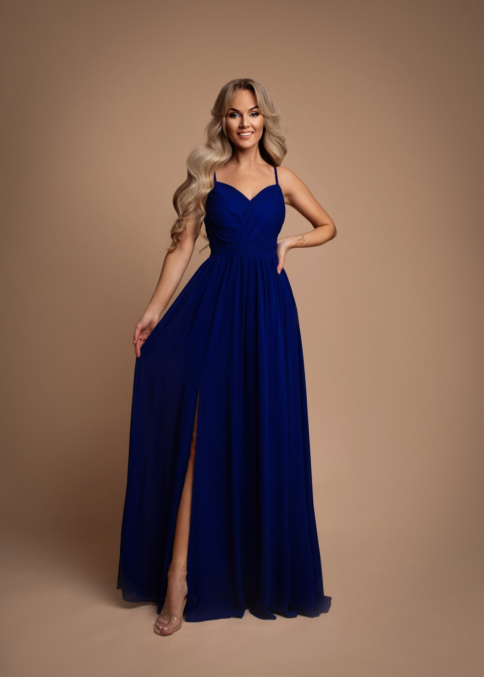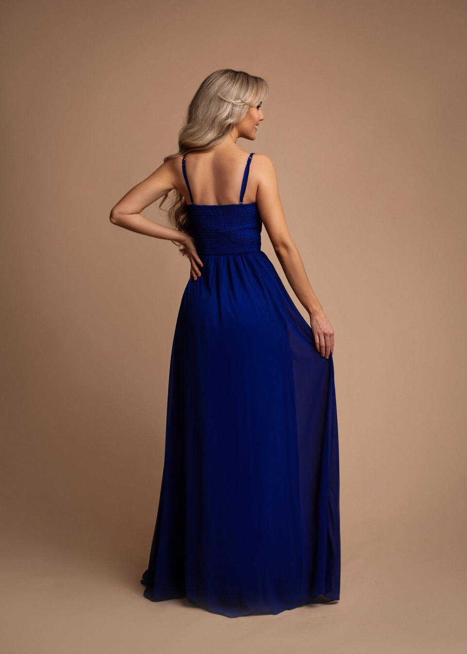 Lange galajurkje met split, aansluitende top met een lage uitgesneden sweetheart halslijn, mooi decolleté, open rug met dunne schouderbandjes, elastische rug band, hoge geplooide taille, tulp rokje, afgemaakt van soepele vallende chiffon met satijn voering, keuze van S / M / L, slim fit galakledij perfect voor schoolgala