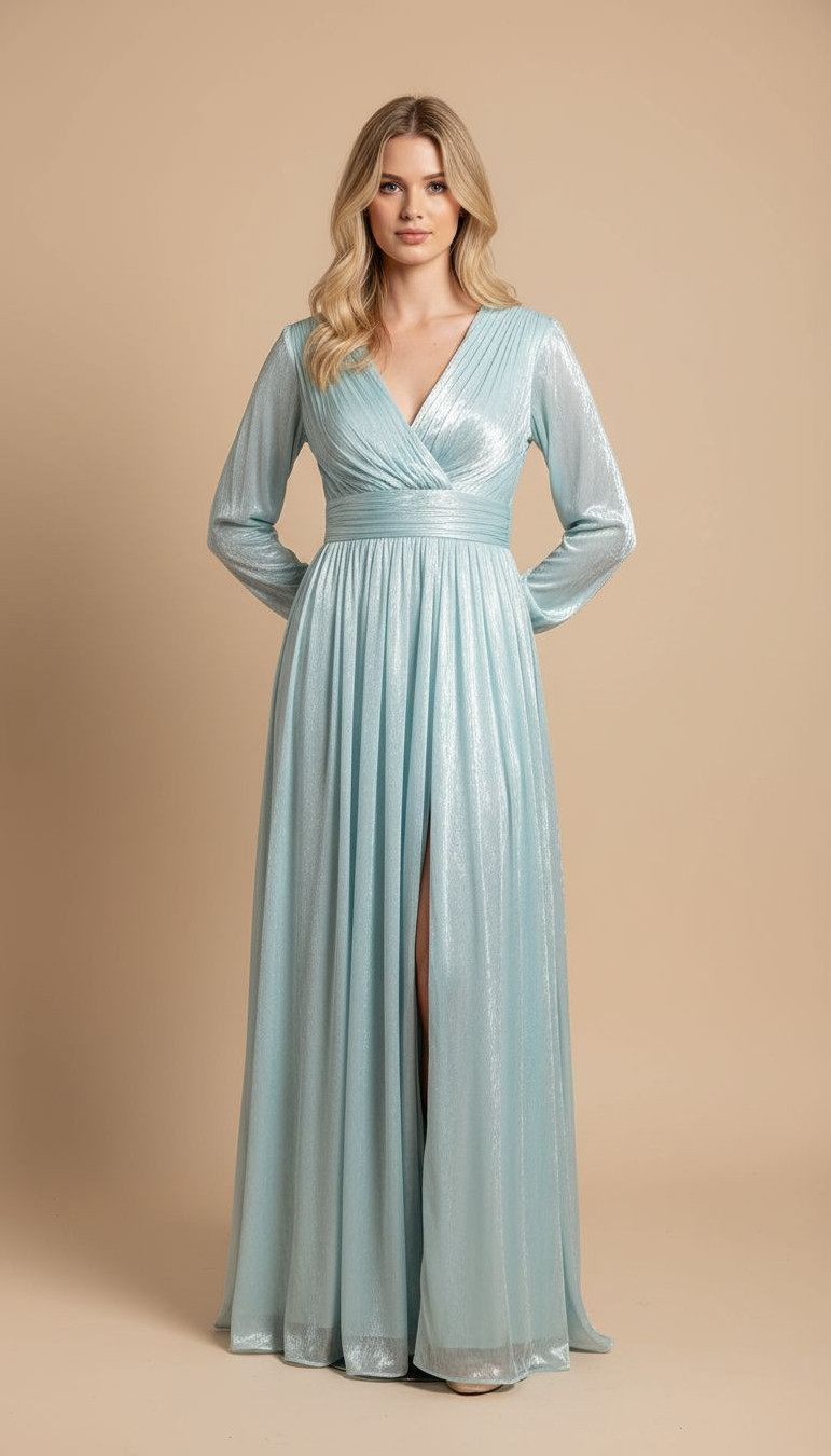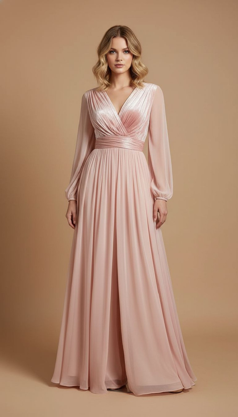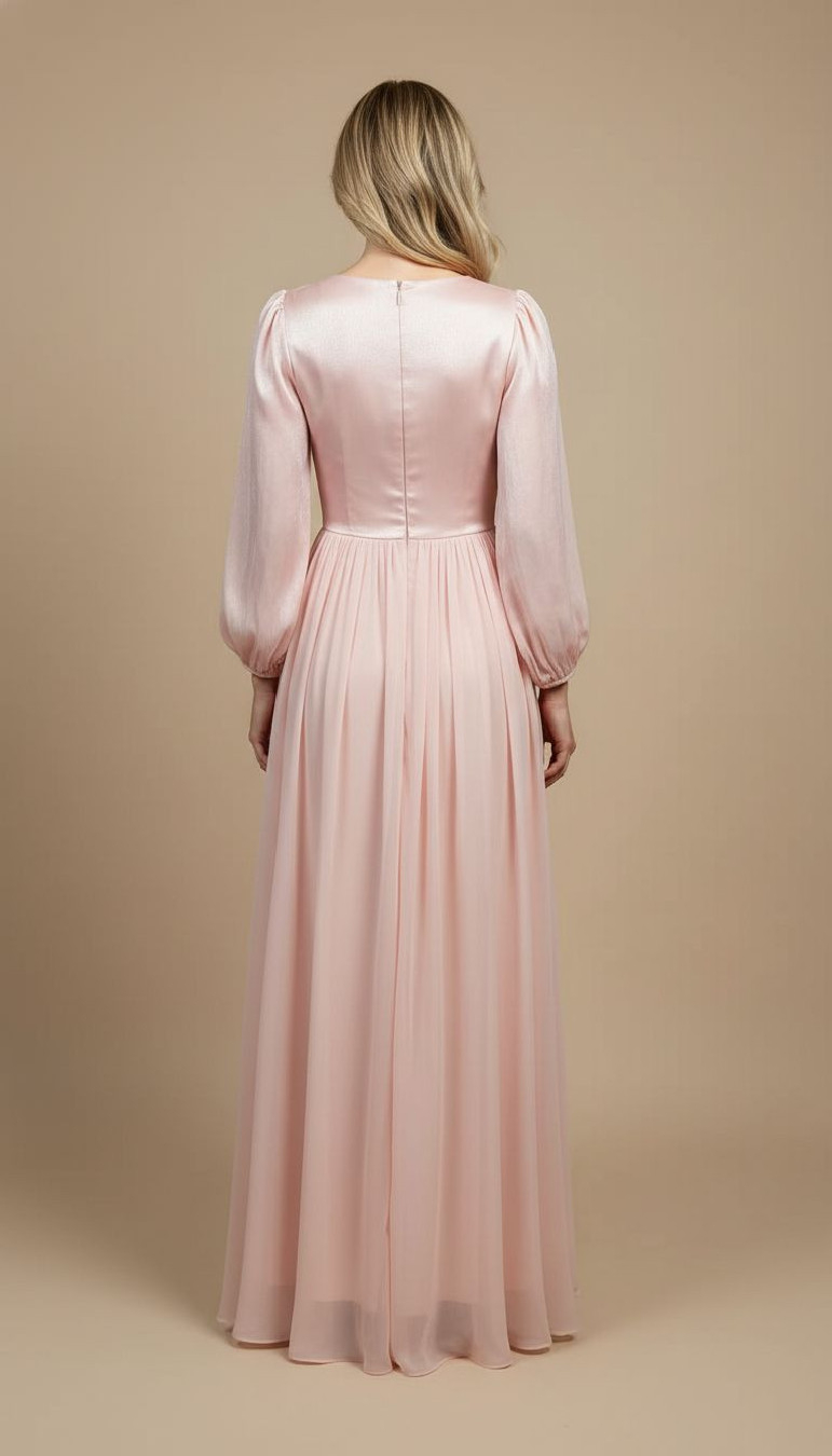 Galajurkje met lange mouw, nauwsluitende lijfje met V-hals, een verstevigd borstlijn dat zorgt voor een mooi decolleté, een bedekt rug met ritssluiting in de middelnaad, hoge geplooide flatterende taille, wijde uitlopende rokje, aangepaste A-lijn chiffon feestelijke jurkje, satijn voering, keuze van S / M / L