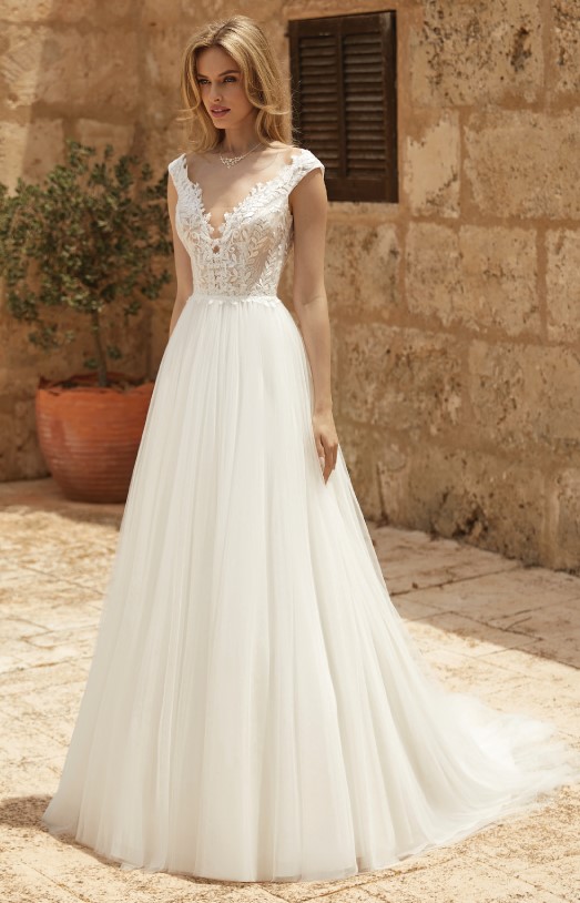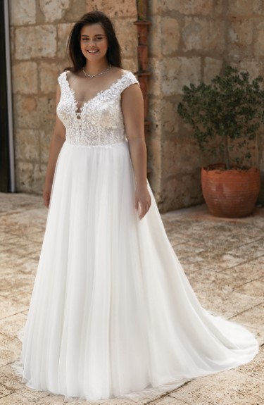 Adorned princess-line bridal dress, form fit lace bodice with V-neckline, supports fine cleavage, has shoulder straps, high pleated waistline adorned satin band, swirling fishtail skirt, discrete back zipper closure, choice of S / M / L / XL / 2XL / 3XL / 4XL / 5XL, register free or login to view price