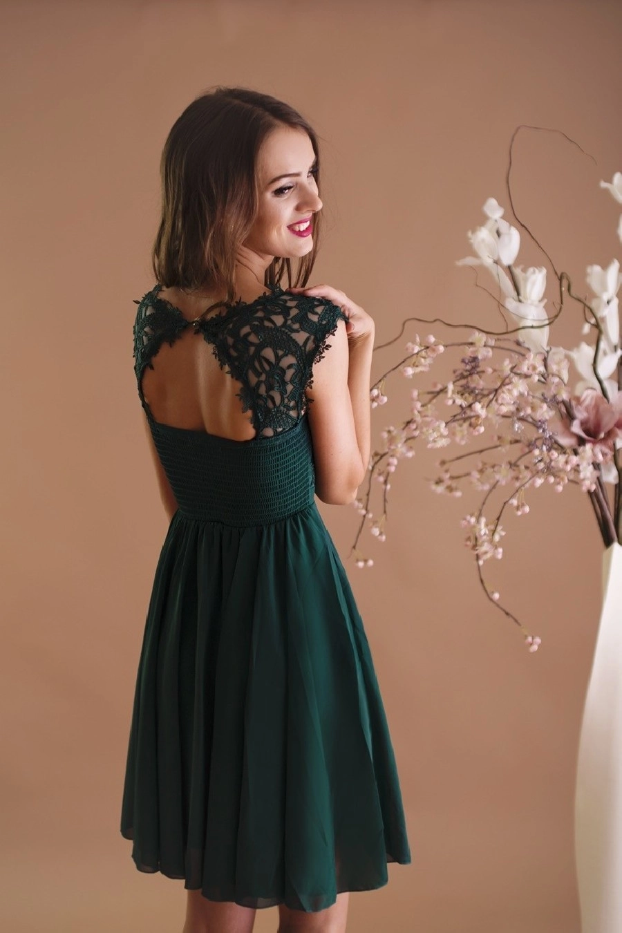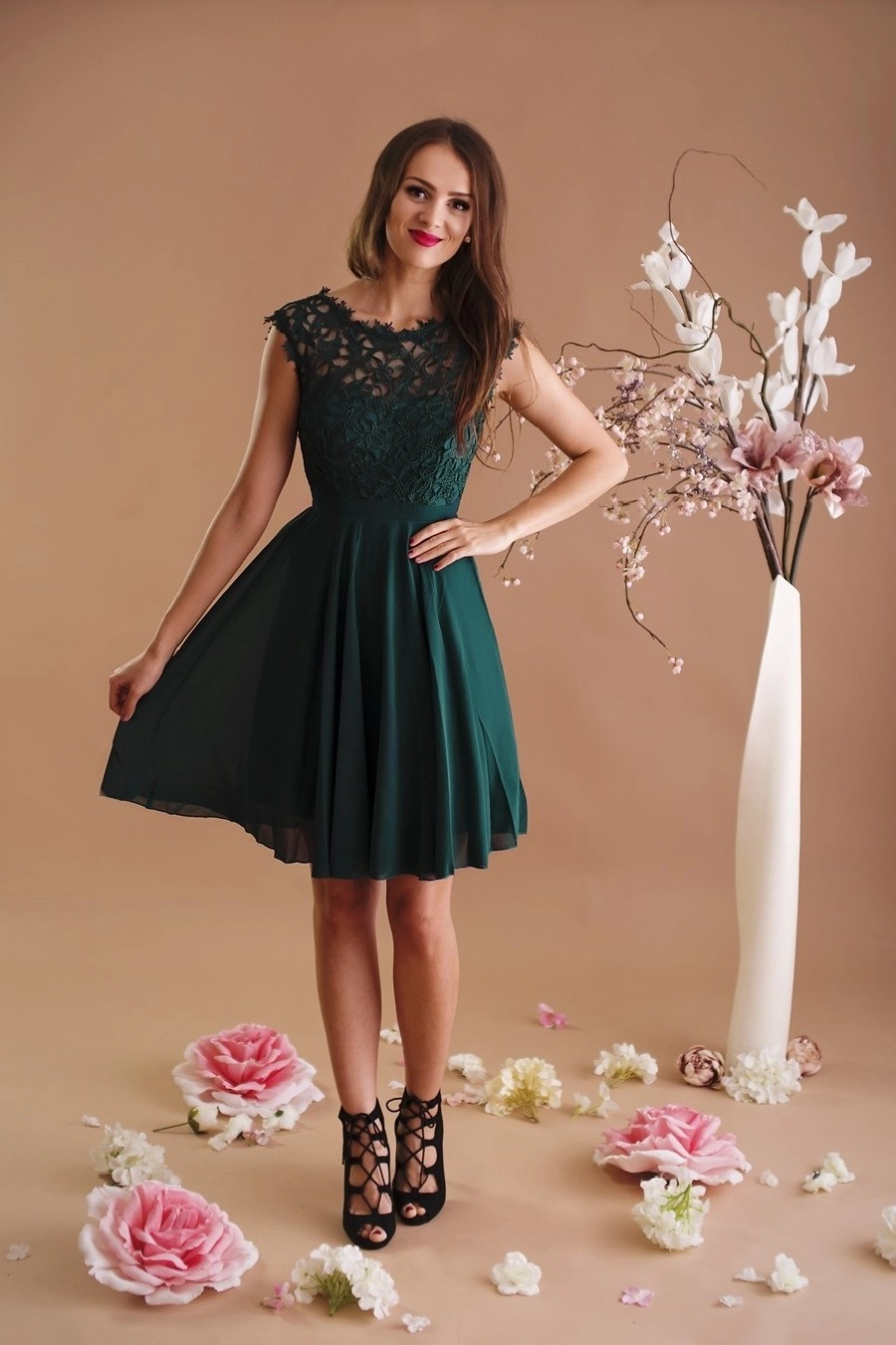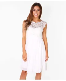 Tea lenght dress adorned lace bodice, form hug with scoop neckline, has enhanced burst-line, under the covered cleavage, with shoulder straps, back split with elastic band, form enhanced high waistline, swirling knee high skirt, chiffon mix lace, full satin lining, choice of S / M / L