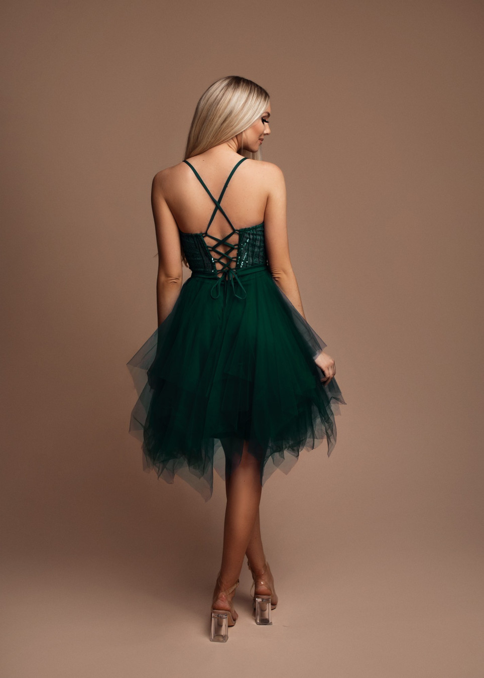 Adorned sequins cocktail dress, form fit bodice with sweetheart necklinne, enhanced bust-line, supports beautiful cleavage, has slit back with spaghetti straps, zipper in the middle seam, high pleated waistline, swirling skirts, chiffon party piece with satin lining, choice of S / M / L