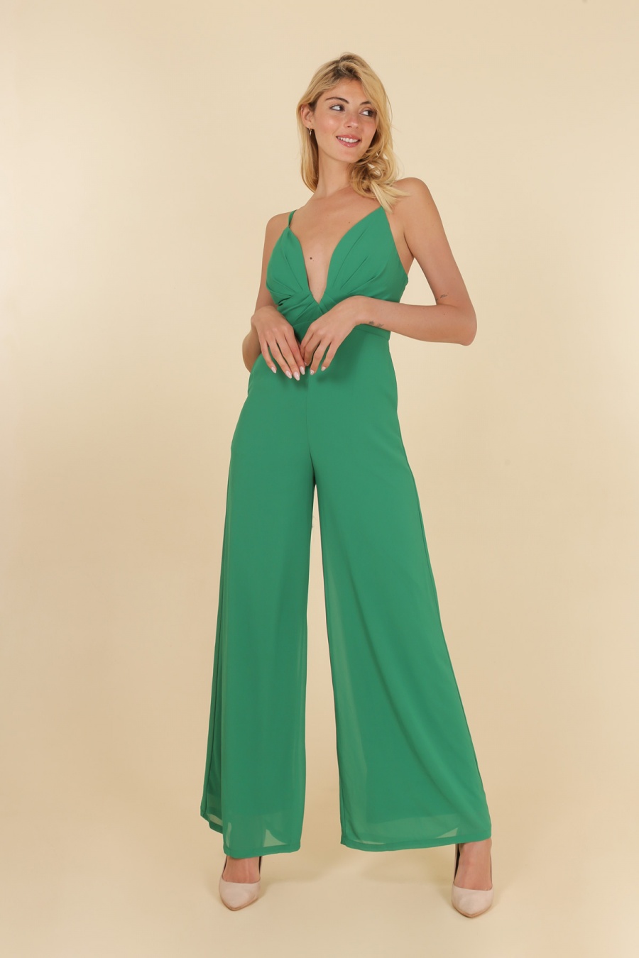 Halter top jumpsuit, form hug bodice with an enhanced burst-line, V-neckline, supports fine cleavage, bare back with spaghetti straps, high pleated waistline, combination with baggy pants, play suit finished in high quality polyester with satin linining, choice of S / M / L / XL