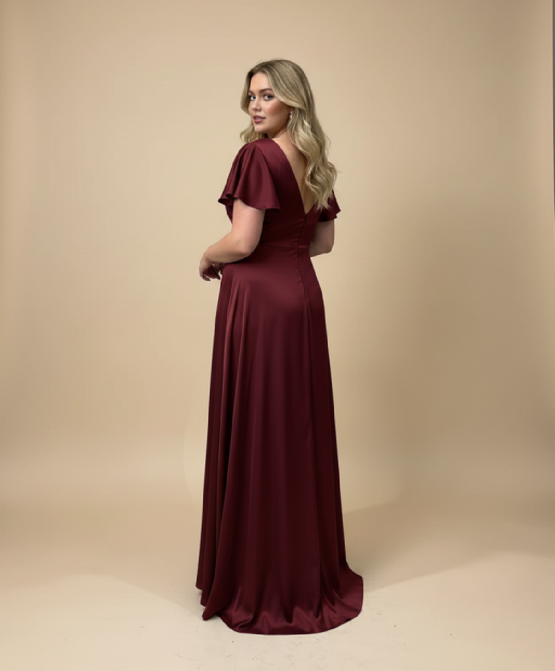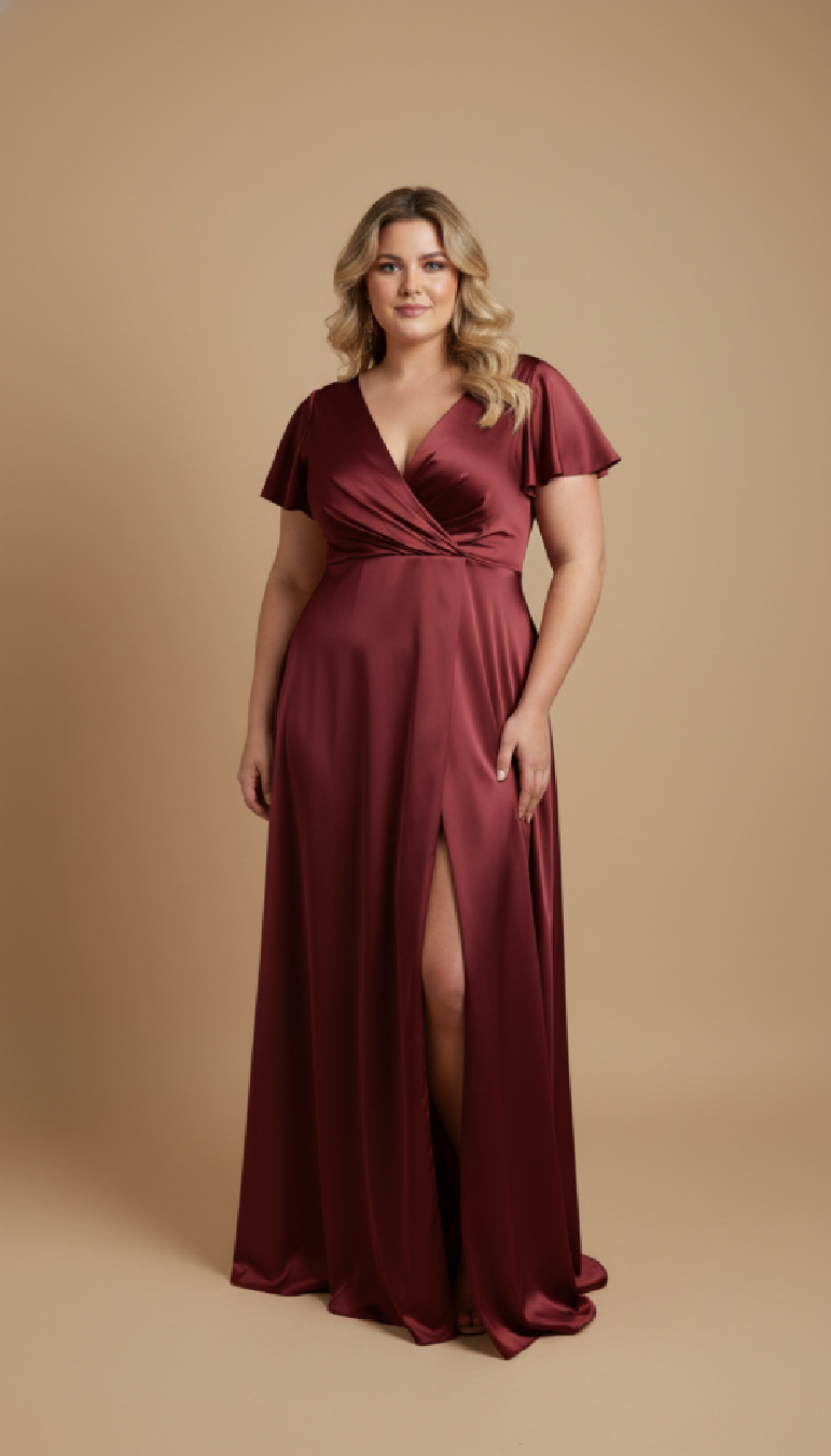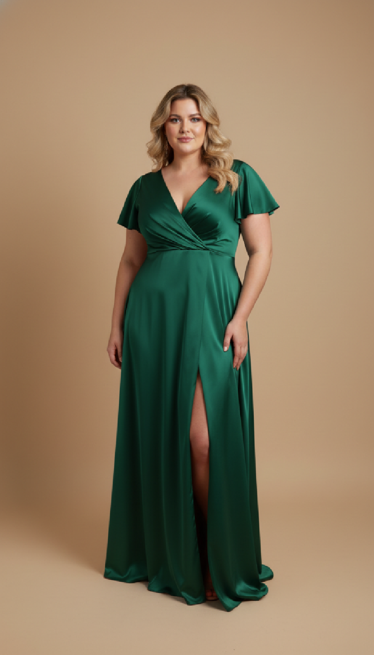 Maxi evening dress with short butterfly sleeves, form fit bodice with a crossover V-neckline, slitted top back, with discreet zipper in the middle seam, burst-line supports fine cleavage, high pleated waitline, skirt is slightly flared and has a front slit, creating a graceful silhouette while allowing freedom of movement, choice of 2XL / 3XL / 4XL / 5XL