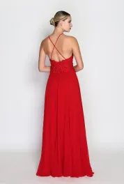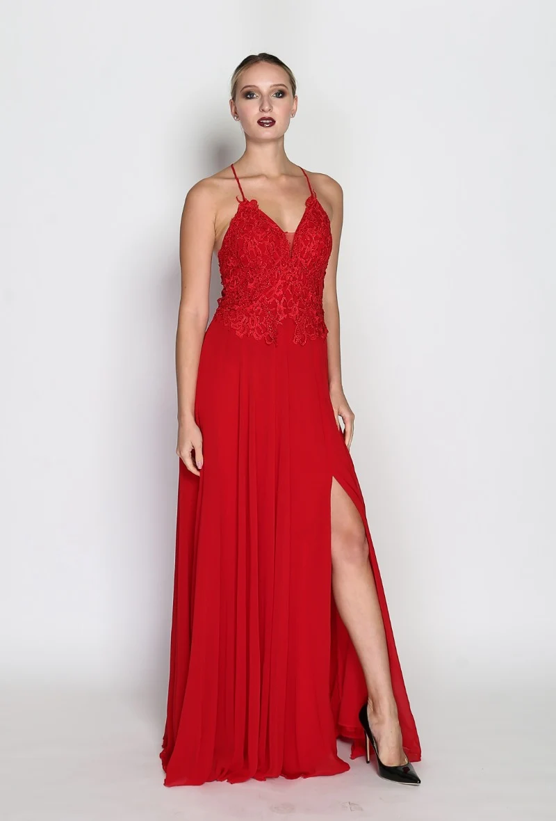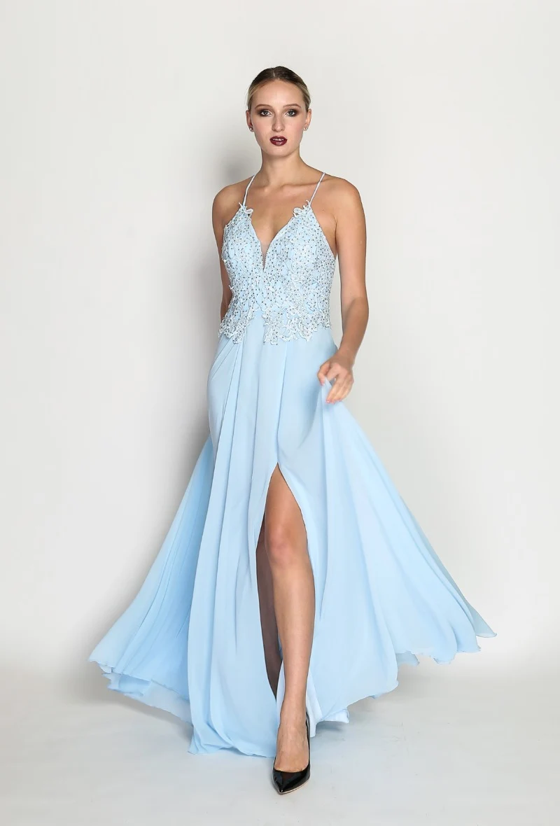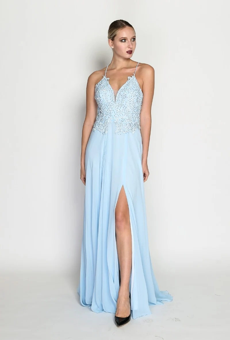 Aangepaste A-lijn galajurk, nauwsluitend lijf met V-hals, verstevigende borstlijn die een mooi decolleté ondersteunt, heeft dunne schouderbandjes, open rug met discrete rits in de midden naad, hoge geplooide taille, uitlopende rok met split aan de voorkant, feestelijke jurk van polyester met satijn voering, keuze uit S / M / L / XL