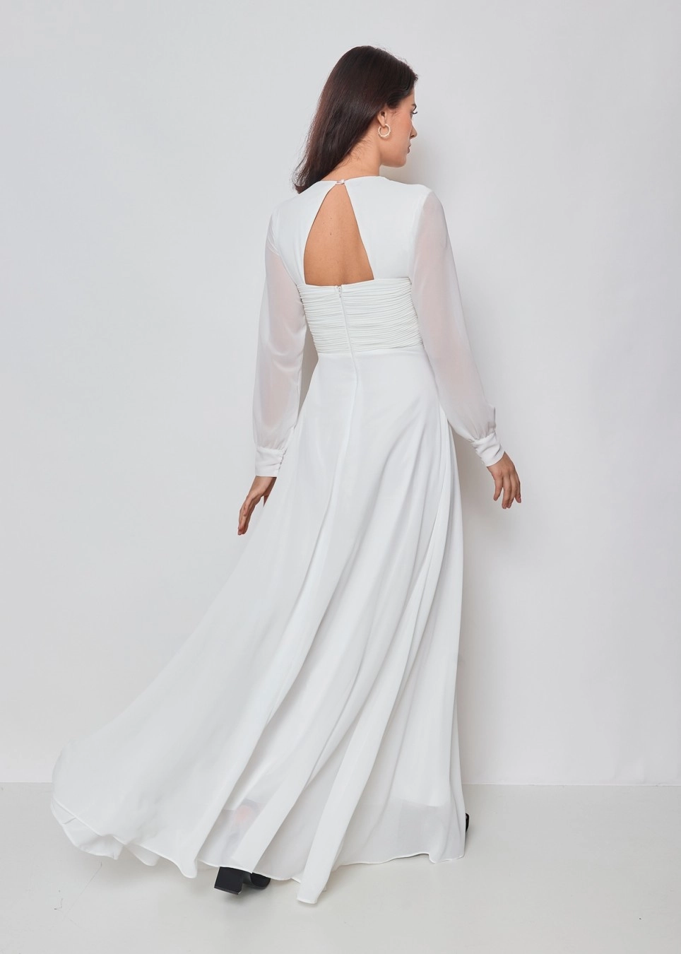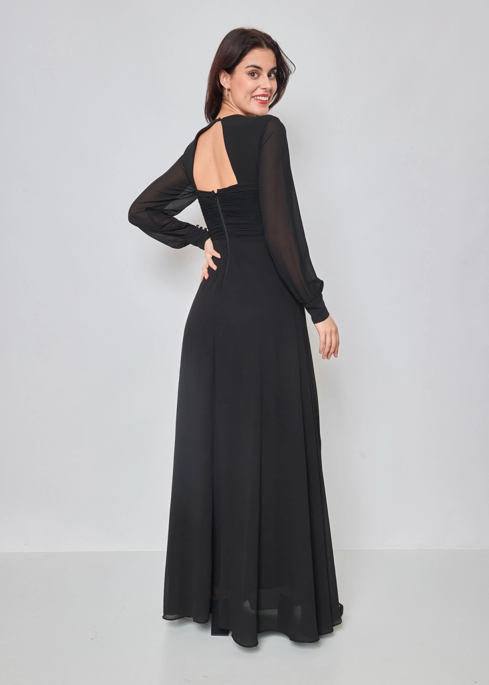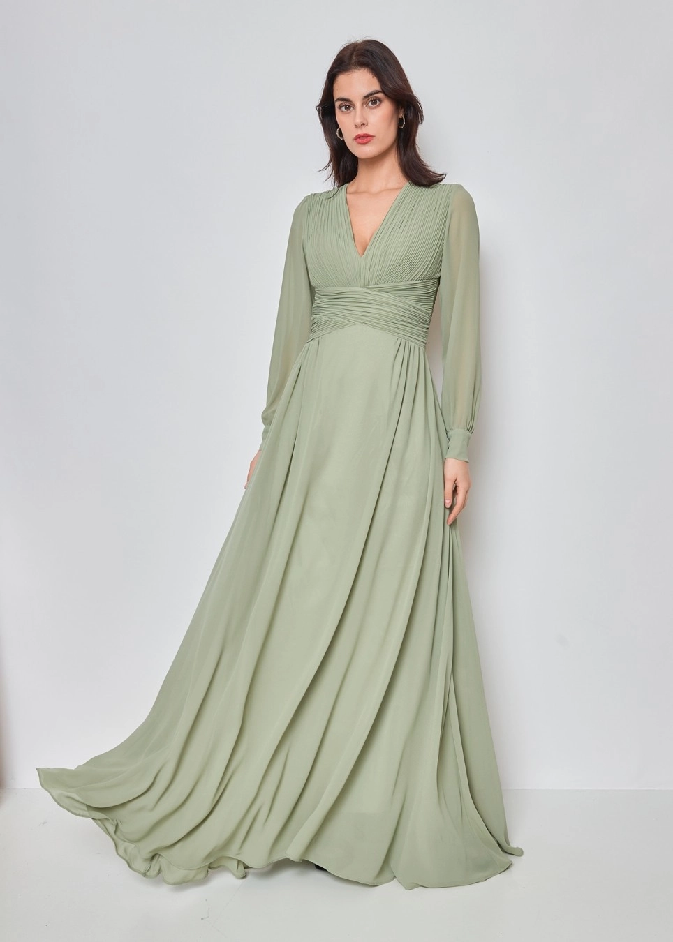 Lange galajurk met plooi, nauwsluitende bovenlijf met V-hals, ondersteunt mooi decolleté, lange mouw jurk, open top rug, hoge geplooide taille, wijde uitlopende rok