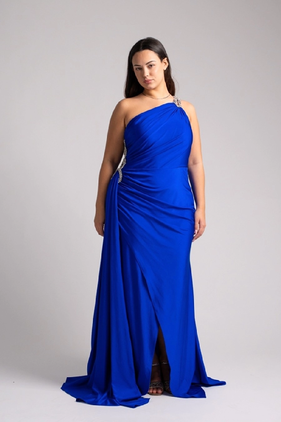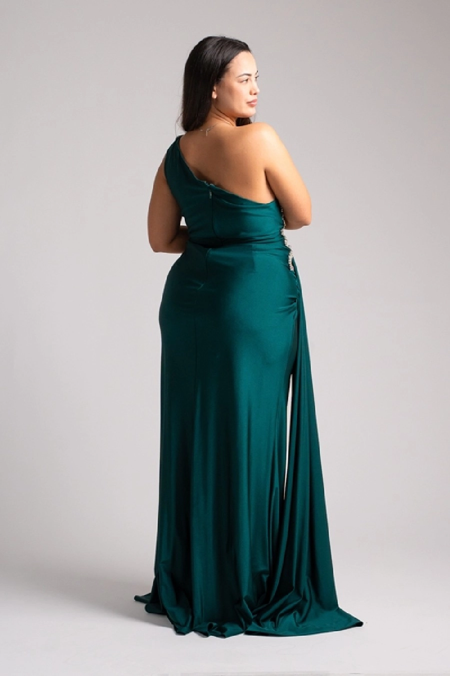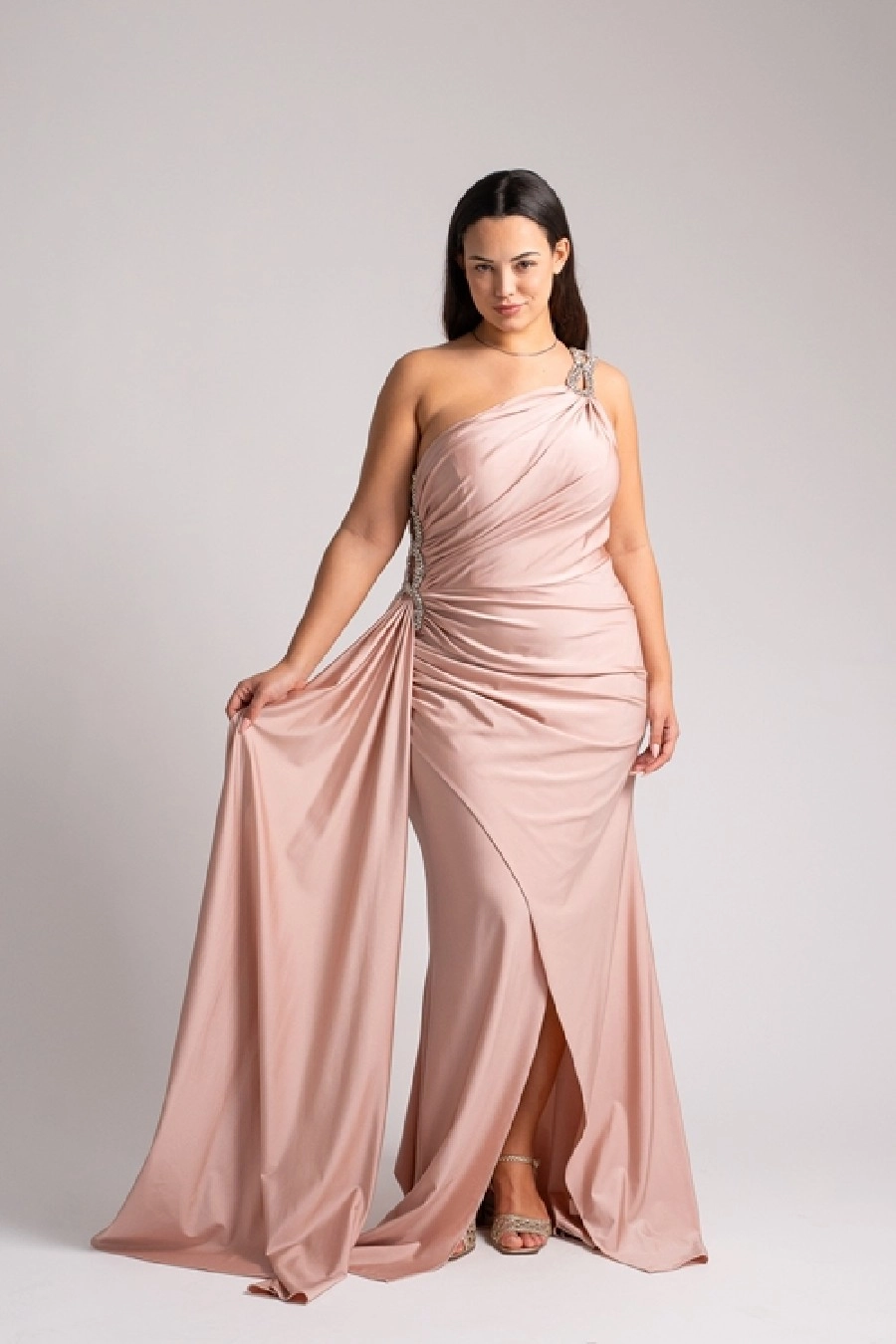 Avondjurk met kniehoog split, heeft een brede schouderband, asymmetrische halslijn, verstevigd borstlijn, hoge geplooide taille versierd met kraaltjes, wijd uitlopende rok