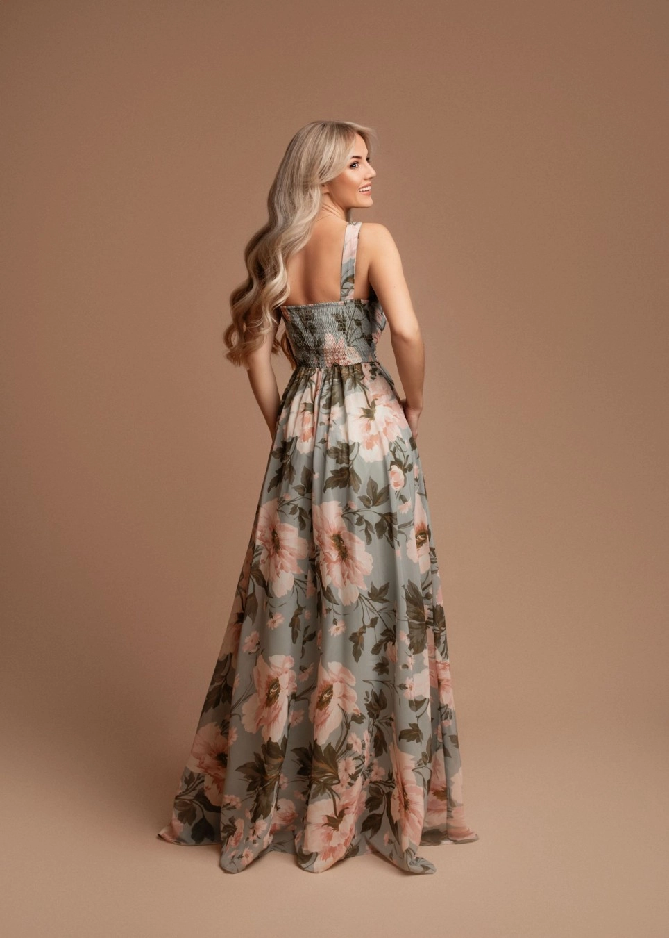 Halter top feestelijke jurk, met bloemenprint, bovenlijf met scoop halslijn, heeft split, open rug met elastische band, hoge geplooide taille, wijd uitlopende rok, A-lijn stijl